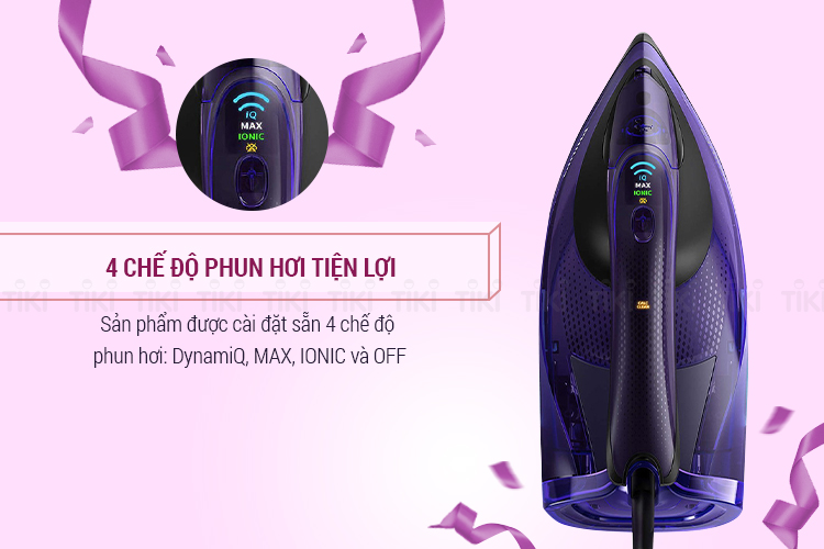 Sản phẩm được cài đặt sẵn 4 chế độ phun hơi: DynamiQ, MAX, IONIC và OFF. Ngoài chế độ cảm biến DynamiQ, chế độ MAX cho phép bạn ủi phẳng các nếp nhăn khó nhằn bằng luồng phun hơi mạnh và liên tục. Chế độ Ionic hay còn gọi là ion hóa, cho phép để hơi nước thấm sâu và vệ sinh. Lựa chọn chế độ Off nếu như bạn muốn ủi phẳng quần áo mà không dùng hơi nước.