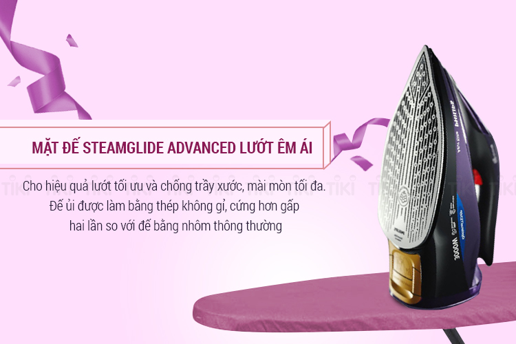 SteamGlide Advanced là mặt đế tốt nhất, cao cấp nhất của chúng tôi cho hiệu quả lướt tối ưu và chống trầy xước, mài mòn tối đa. Đế ủi được làm bằng thép không gỉ, cứng hơn gấp hai lần so với đế bằng nhôm thông thường. Mặt đế được phủ 6 lớp, bao gồm lớp titan cải tiến, cho bàn ủi lướt êm vượt trội và ủi phẳng quần áo nhanh hơn.