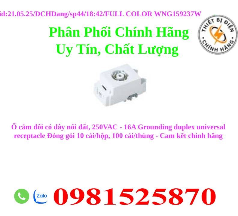 Ổ cắm đôi có dây nối đất, 250VAC - 16A Grounding duplex universal receptacle Đóng gói 10 cái/hộp, 100 cái/thùng - Cam kết chính hãng - Do sản phẩm nhập về kho liên tục với số lượng lớn, nên chưa kịp cập nhật tất cả sản phẩm trên trang wed, quý khách vui lòng liên hệ hotline để biết thêm chi tiết vè giá sản phẩm, chiết khấu, ưu đãi khuyến mãi,... - Hotline: 0914640514