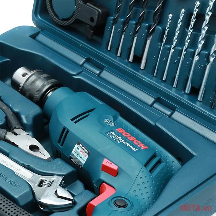 Trọn bộ máy khoan và các phụ kiện khác được sắp xếp gọn trong hộp đựng chuyên dụng. Với cách sắp xêp này thì bạn hoàn toàn có thể mang đi di chuyển tới mọi nơi làm việc.