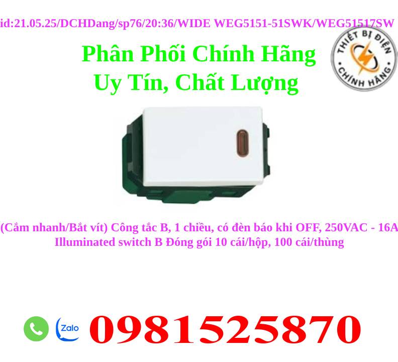 (Cắm nhanh/Bắt vít) Công tắc B, 1 chiều, có đèn báo khi OFF, 250VAC - 16A Illuminated switch B Đóng gói 10 cái/hộp, 100 cái/thùng